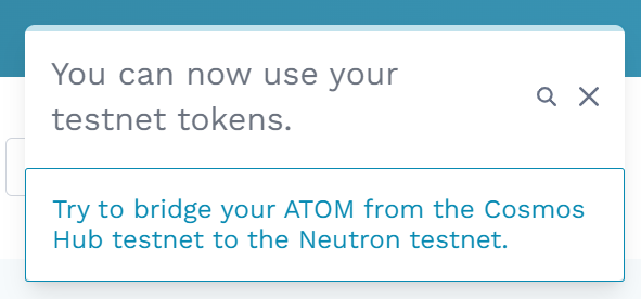 If you hover over the "**You can now use your testnet tokens**," you'll see a message about bridging your testnet ATOM tokens.