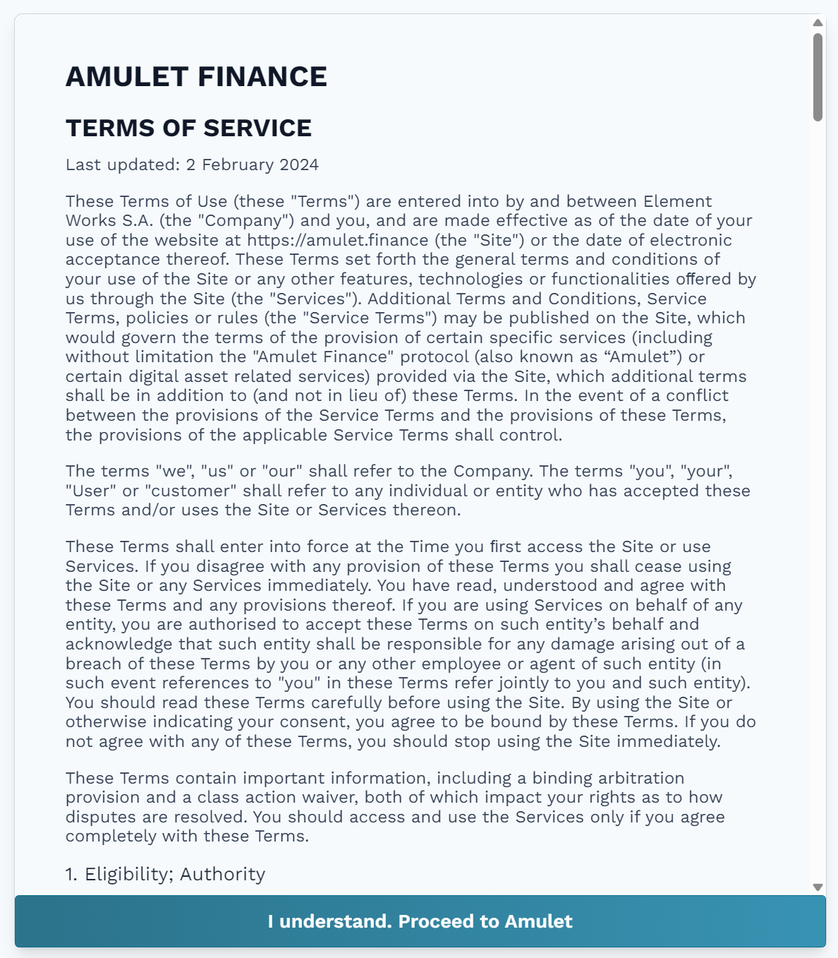 Navigate to the [Amulet testnet](https://testnet.amulet.finance) and accept the Terms of Service by clicking "**I understand. Proceed to Amulet**."
