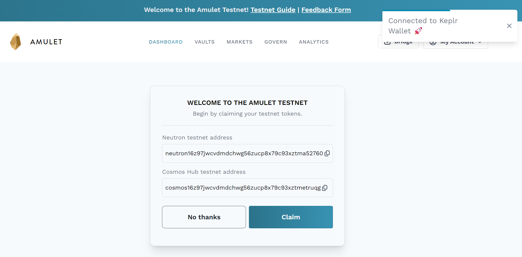 For testnet ATOM and NTRN, we'll use the **Amulet** dashboard to claim the tokens.