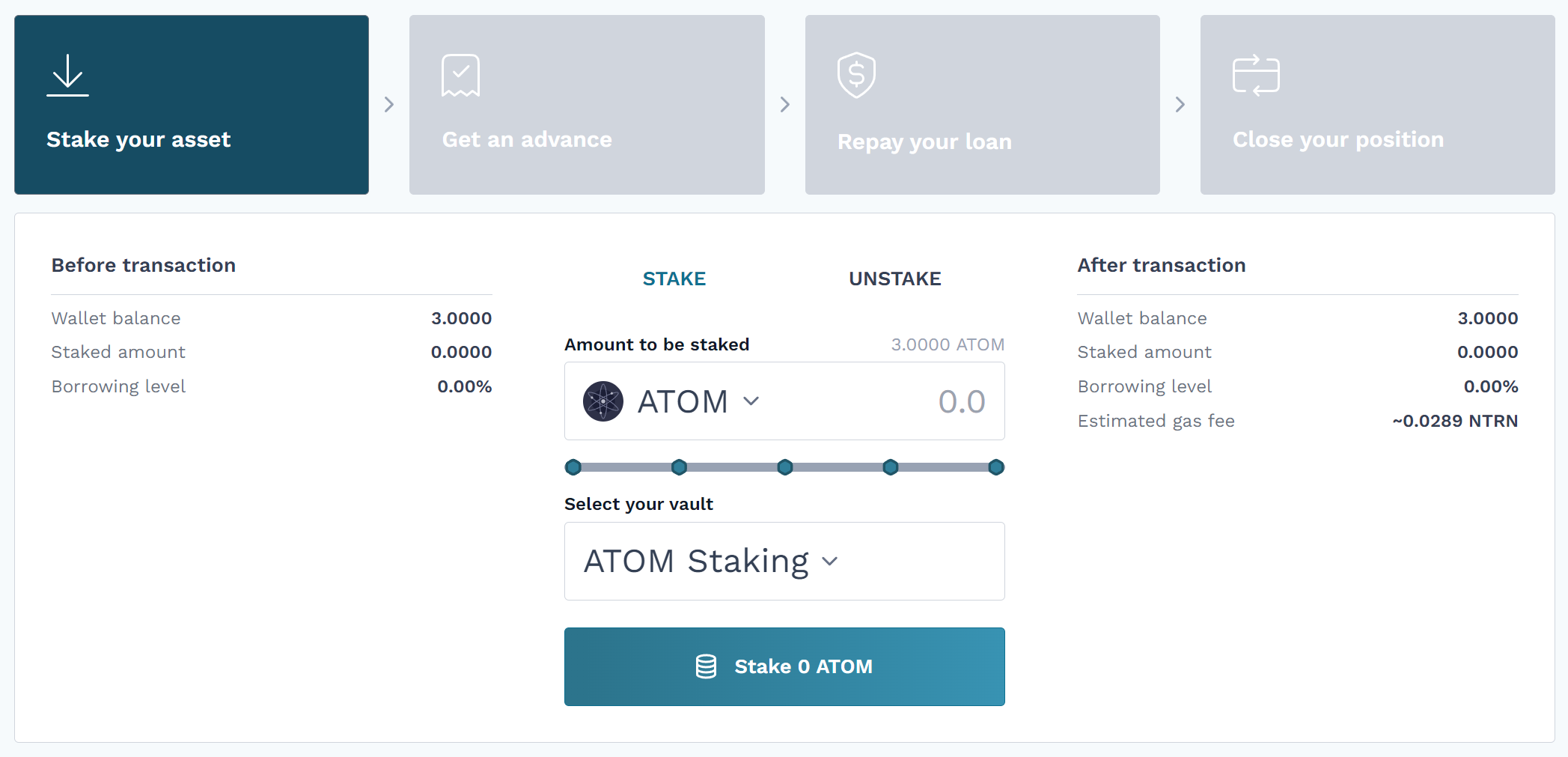 Follow the steps below to claim your testnet ATOM and NTRN, stake it via Amulet and obtain a self-repaying loan.